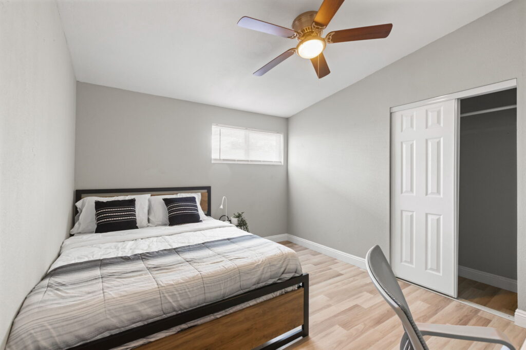 Perfect deal for the perfect stay! Easy access to the kitchen and bathroom. Full bed, fan, and nightstand with lamp.